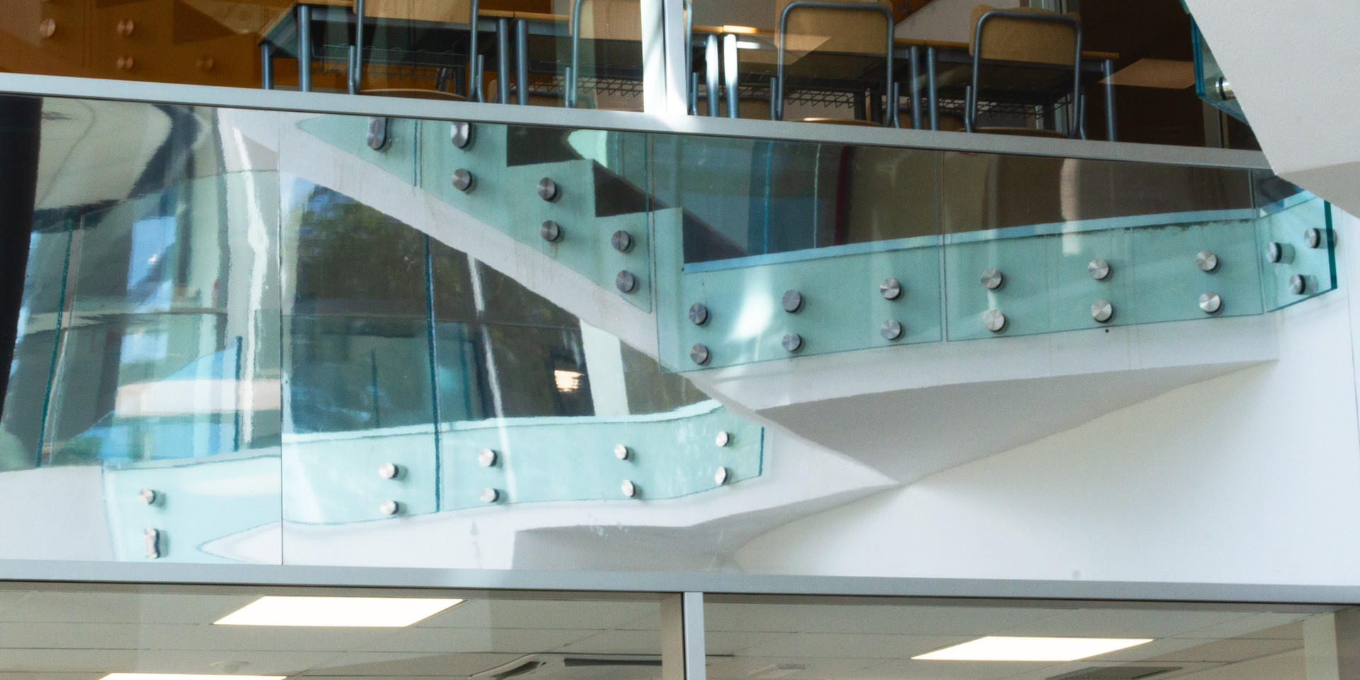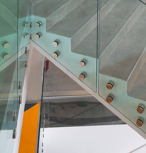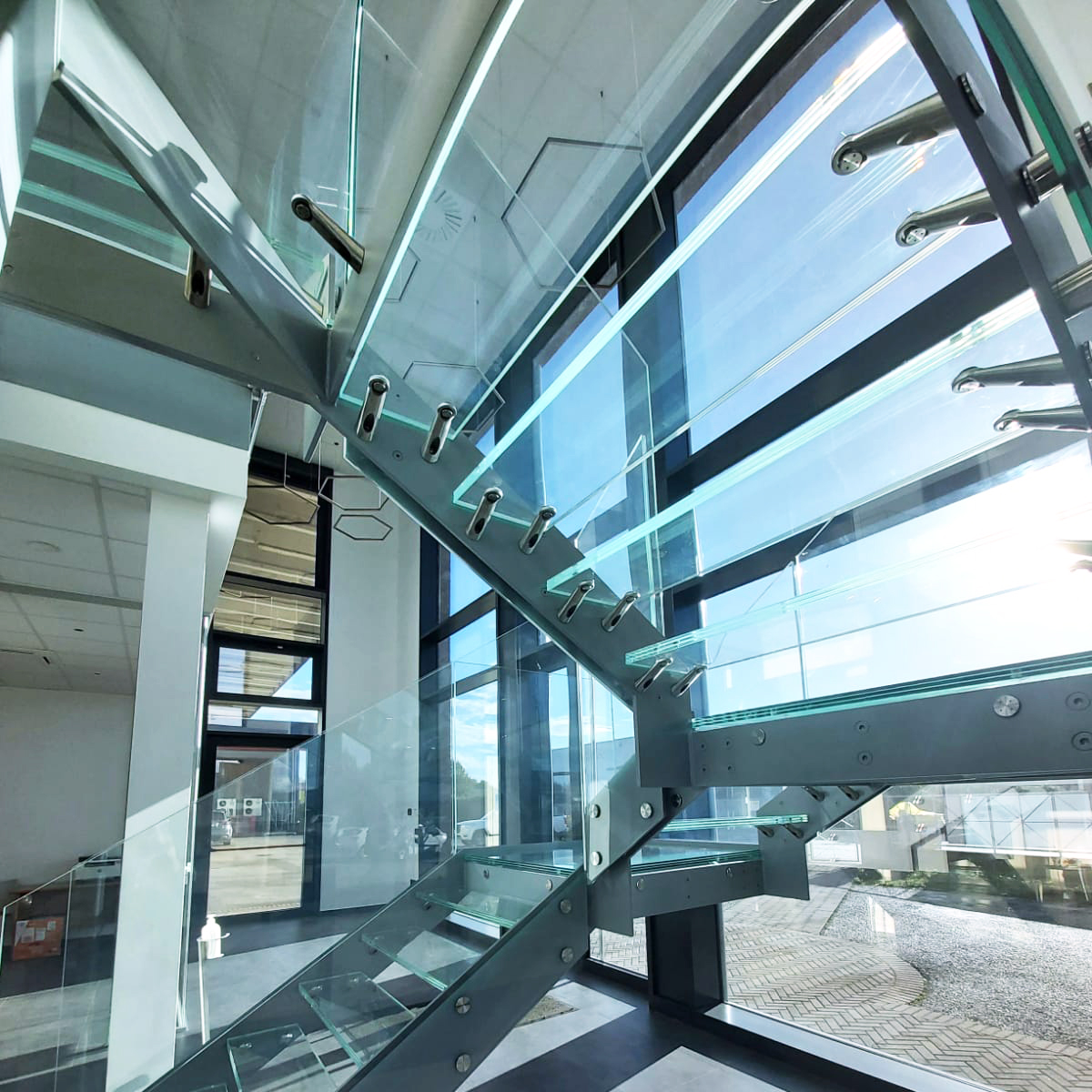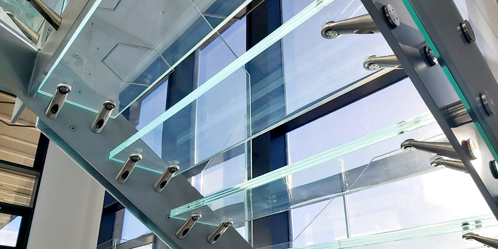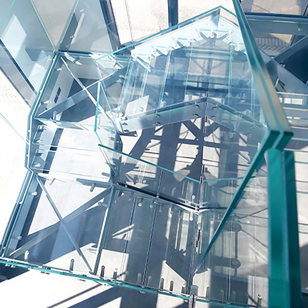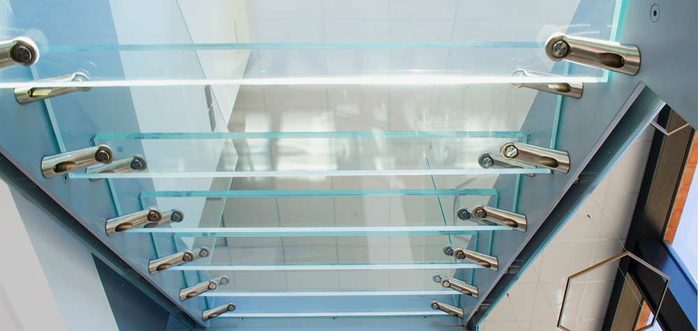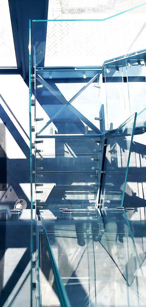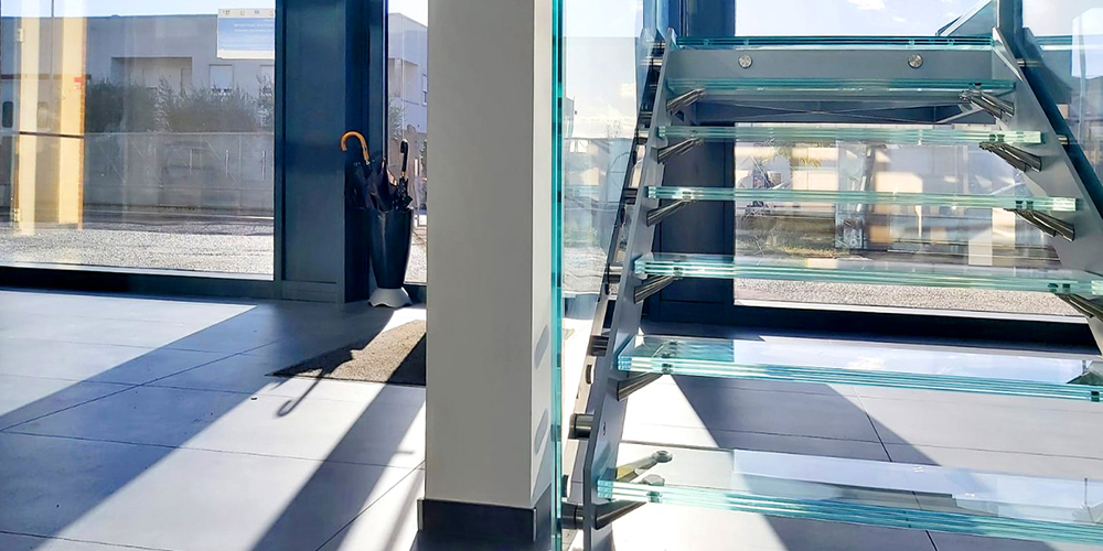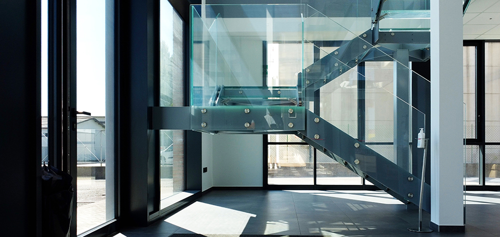 Quattro piani di scale con parapetti in vetro, un effetto straordinario.