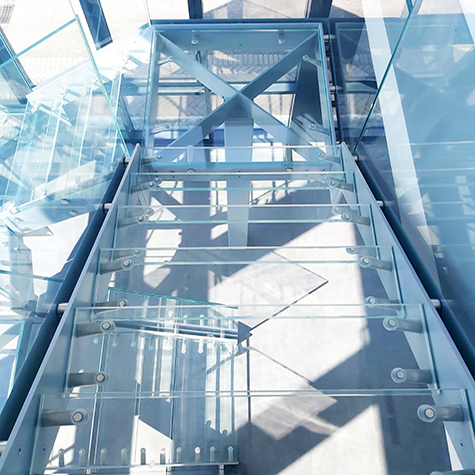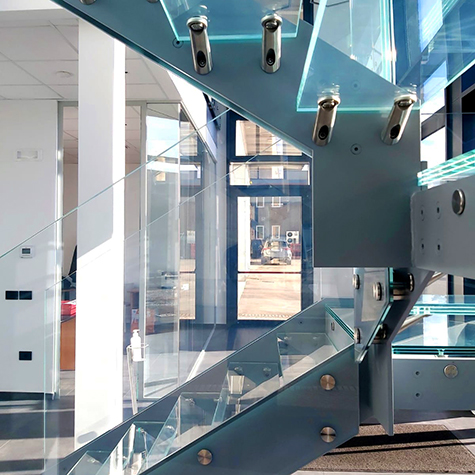 Struttura in metallo, gradini in vetro con supporti per gradini in acciaio AISI 304 e distanziatori GIOTTO Ø60 certificati 2kN UNI e vetri stratificati 1010.4 con plastico SG.