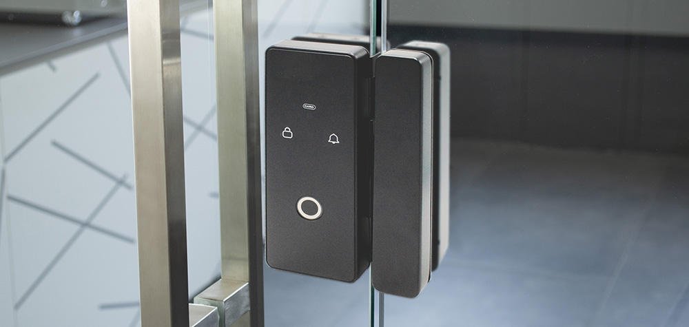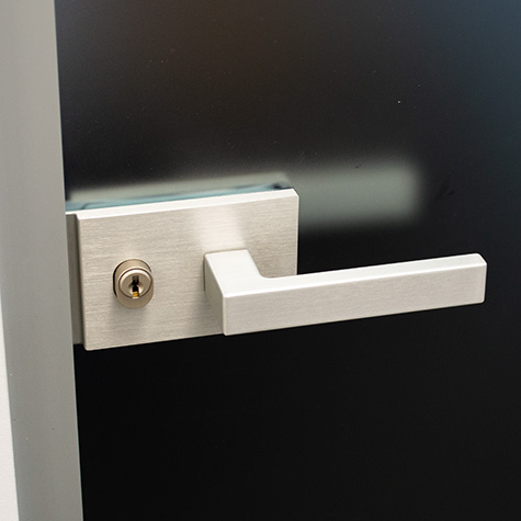 Le porte tutto vetro sono dotate di serrature M-Lock Stop, con e senza chiave, abbinate alle cerniere Linea mentre per la versione intelaiata abbiamo utilizzato M-Lock IN. Entrambe le serrature sono a chiusura magnetica.