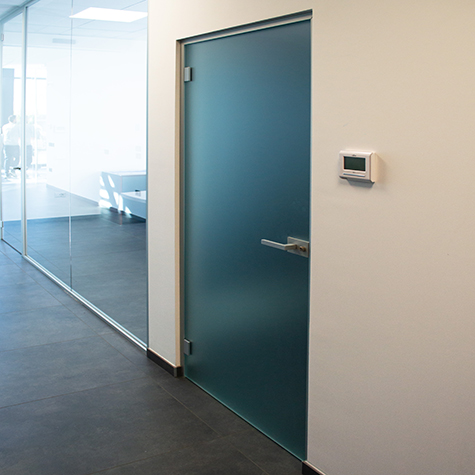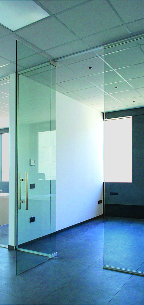 Per la realizzazione delle pareti in vetro abbiamo scelto i profili in alluminio Vista della Parete Leonardo, nella finitura anodizzato argento, utilizzati con porte sia tutto vetro che intelaiate.